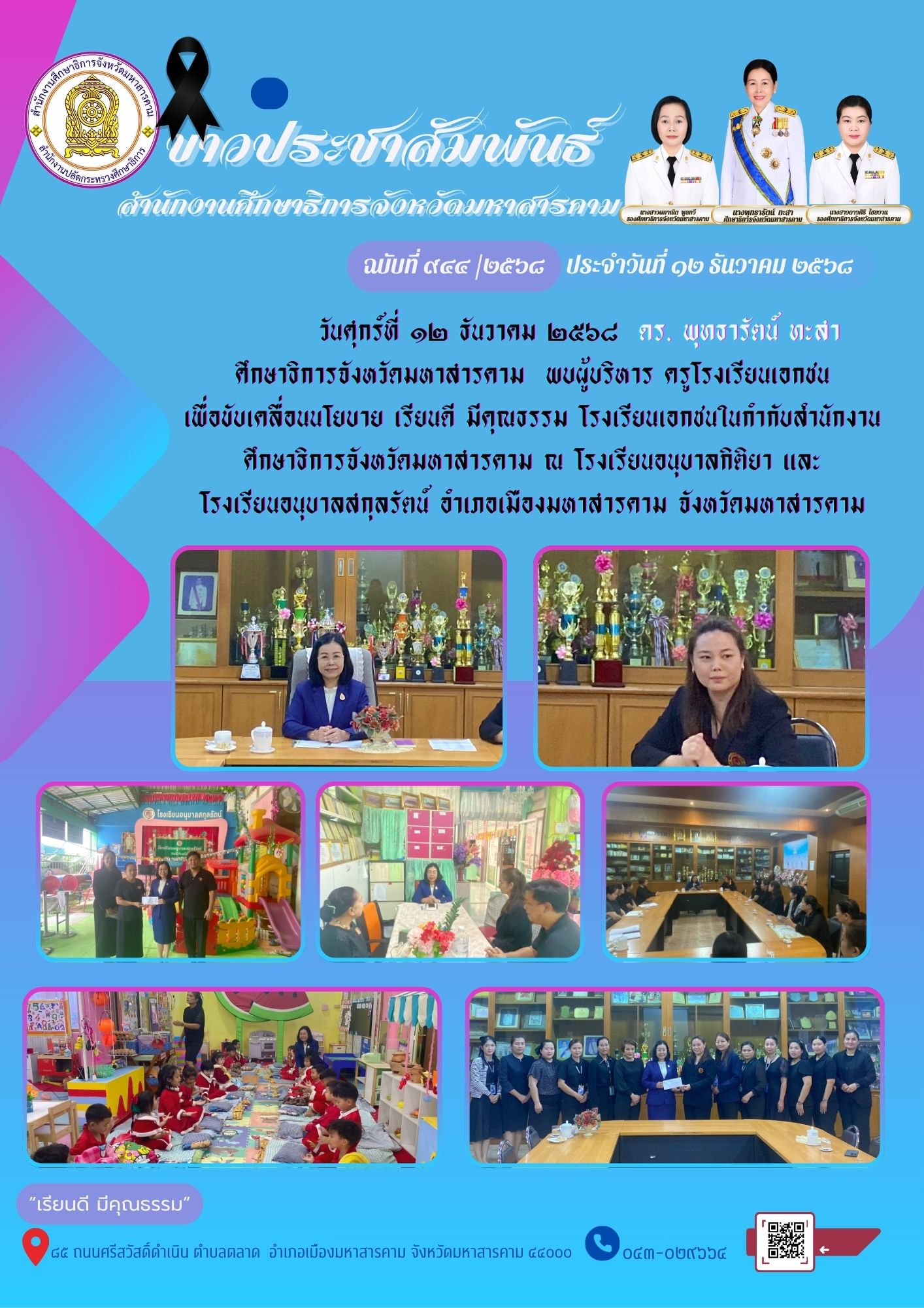 กิจกรรม วันศุกร์ที่ ๑๒ ธันวาคม ๒๕๖๘ ดร. พุทธารัตน์ ทะสา ศึกษาธิการจังหวัดมหาสารคาม พบผู้บริหาร ครูโรงเรียนเอกชน เพื่อขับเคลื่อนนโยบาย เรียนดี มีคุณธรรม โรงเรียนเอกชนในกำกับสำนักงานศึกษาธิการจังหวัดมหาสารคาม ณ โรงเรียนอนุบาลกิติยา และโรงเรียนอนุบาลสกุลรัตน์ อำเภอเมืองมหาสารคาม จังหวัดมหาสารคาม Posted on 15 December 2025 by admin (kittitat) admin (kittitat) วันศุกร์ที่ ๑๒ ธันวาคม ๒๕๖๘ เวลา ๑๗.๐๐ น. ดร. พุทธารัตน์ ทะสา ศึกษาธิการจังหวัดมหาสารคาม พร้อมด้วย นางอรดี วรรณคำ ผู้อำนวยการกลุ่มพัฒนาการศึกษา เข้าร่วมพิธีบำเพ็ญกุศลปัญญาสมวาร ๕๐ วัน เพื่ออุทิศถวายเป็นพระราชกุศล สมเด็จพระนางเจ้าสิริกิติ์ พระบรมราชินีนาถ พระบรมราชชนนีพันปีหลวง ณ วัดปัจฉิมทัศน์ ตำบลตลาด อำเภอเมืองมหาสารคาม จังหวัดมหาสารคาม โดยมี นายสมเกียรติ วิริยะกุลนันท์ รองผู้ว่าราชการจังหวัดมหาสารคาม เป็นประธานฝ่ายฆราวาส วันที่ 14 ธันวาคม 2568 ดร.พุทธารัตน์ ทะสา ศึกษาธิการจังหวัดมหาสารคาม มอบหมายให้ นางสาวผกาณิต พูลทวี รองศึกษาธิการจังหวัดมหาสารคาม พร้อมด้วย นางสาวธัญญลักษณ์ รัตนแสนศรี นักวิเคราะห์นโยบายและแผนชำนาญการ เข้าร่วมพิธีบำเพ็ญ พระราชกุศลพระราชทานในการออกเมรุ ของ พลทหาร ธนกร สิงหาชาติ ณ ศาลาบำเพ็ญกุศล วัดบ้านเหล่าสุขธัมมาราช ตำบลเม็คดำ อำเภอพยัคภูมิพิสัย จังหวัดมหาสารคาม จัดโดยสำนักงานจังหวัดมหาสารคาม ได้รับเกียรติจากนายกองเอก เสนีย์ มะโน รองผู้ว่าราชการจังหวัดมหาสารคาม เป็นประธาน