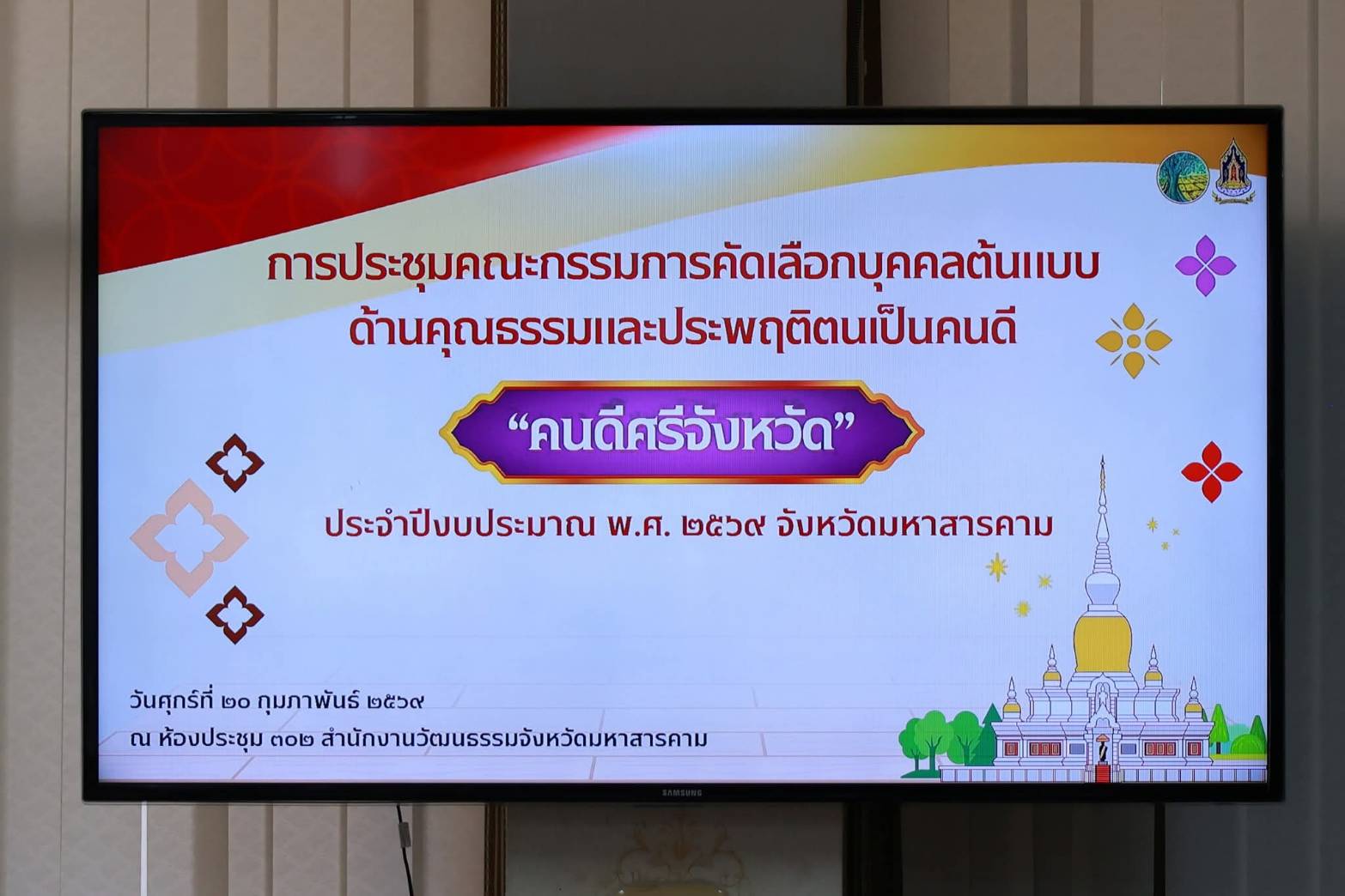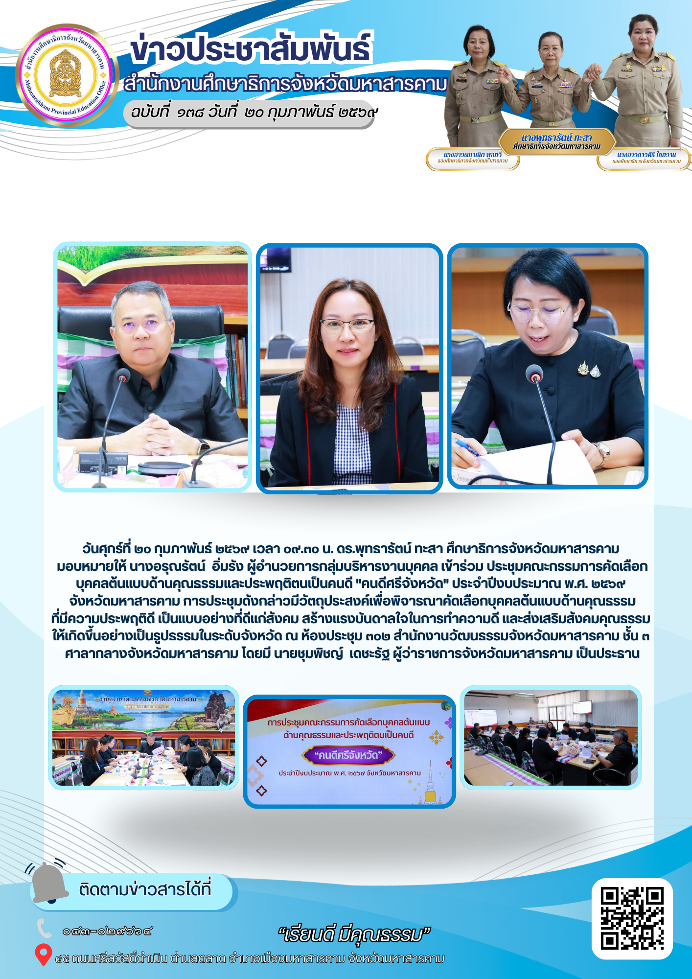 วันศุกร์ที่ ๒๐ กุมภาพันธ์ ๒๕๖๙ เวลา ๐๙.๓๐ น. ดร.พุทธารัตน์ ทะสา ศึกษาธิการจังหวัดมหาสารคาม มอบหมายให้ นางอรุณรัตน์ อิ่มรัง ผู้อำนวยการกลุ่มบริหารงานบุคคล เข้าร่วมประชุมคณะกรรมการคัดเลือกบุคคลต้นแบบด้านคุณธรรมและประพฤติตนเป็นคนดี “คนดีศรีจังหวัด” ประจำปีงบประมาณ พ.ศ. ๒๕๖๙ จังหวัดมหาสารคาม การประชุมดังกล่าวมีวัตถุประสงค์เพื่อพิจารณาคัดเลือกบุคคลต้นแบบด้านคุณธรรมที่มีความประพฤติดี เป็นแบบอย่างที่ดีแก่สังคม สร้างแรงบันดาลใจในการทำความดี และส่งเสริมสังคมคุณธรรมให้เกิดขึ้นอย่างเป็นรูปธรรมในระดับจังหวัด ณ ห้องประชุม ๓๐๒ สำนักงานวัฒนธรรมจังหวัดมหาสารคาม ชั้น ๓ ศาลากลางจังหวัดมหาสารคาม โดยมี นายชุมพิชญ์ เดชะรัฐ ผู้ว่าราชการจังหวัดมหาสารคาม เป็นประธาน