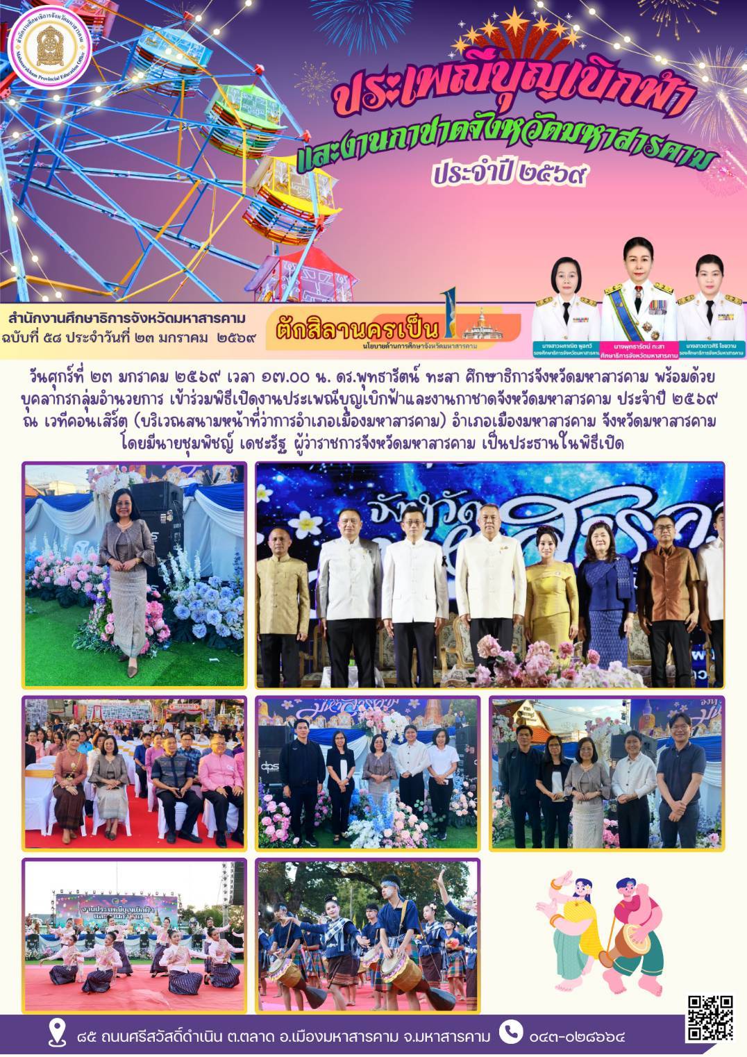 วันศุกร์ที่ ๒๓ มกราคม ๒๕๖๙ เวลา ๑๗.๐๐ น. ดร.พุทธารัตน์ ทะสา ศึกษาธิการจังหวัดมหาสารคาม พร้อมด้วยบุคลากรกลุ่มอำนวยการ เข้าร่วมพิธีเปิดงานประเพณีบุญเบิกฟ้าและงานกาชาดจังหวัดมหาสารคาม ประจำปี ๒๕๖๙ ณ เวทีคอนเสิร์ต (บริเวณสนามหน้าที่ว่าการอำเภอเมืองมหาสารคาม) อำเภอเมืองมหาสารคาม จังหวัดมหาสารคาม โดยมีนายชุมพิชญ์ เดชะรัฐ ผู้ว่าราชการจังหวัดมหาสารคาม เป็นประธาน
