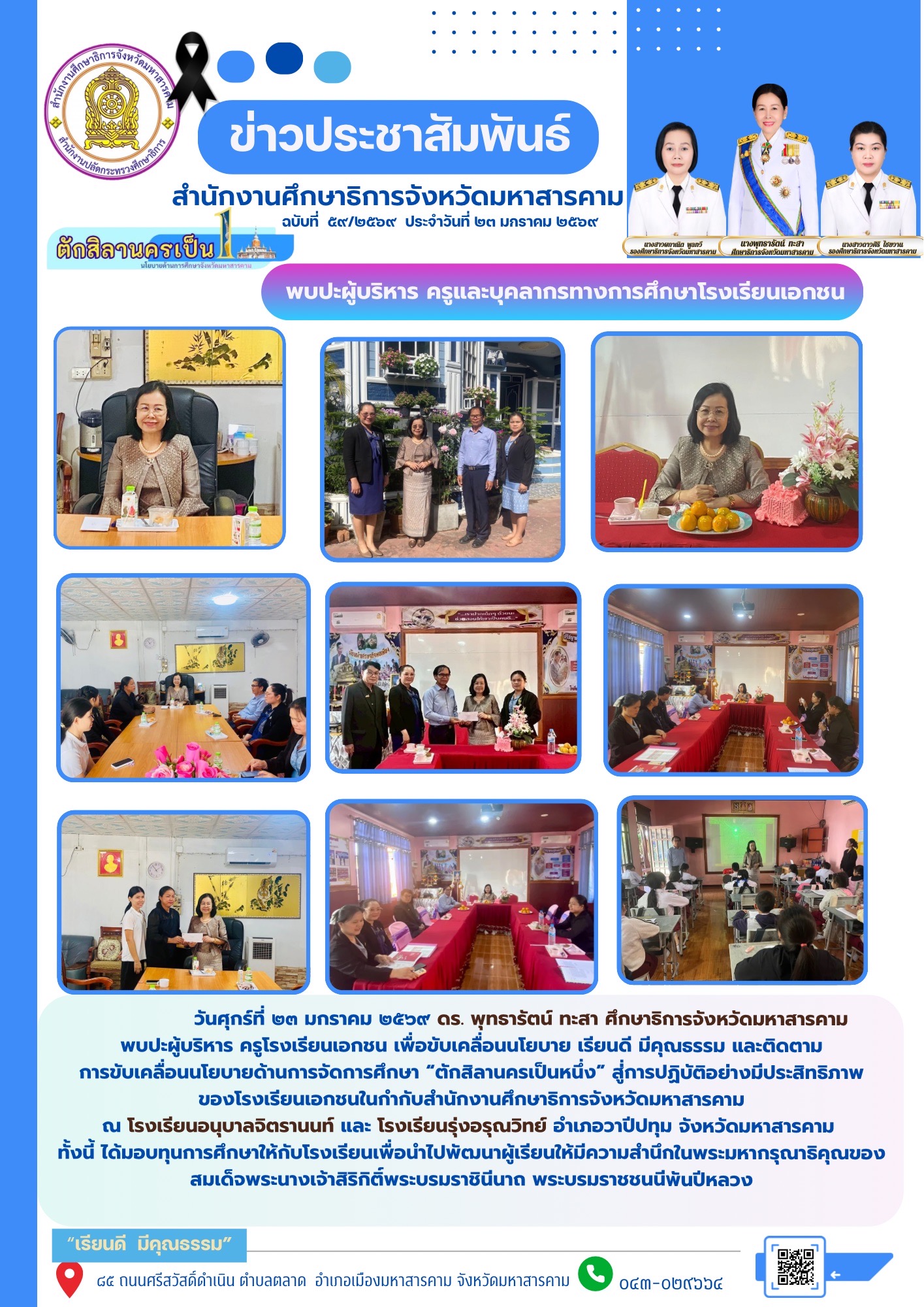วันศุกร์ที่ ๒๓ มกราคม ๒๕๖๙ ดร. พุทธารัตน์ ทะสา ศึกษาธิการจังหวัดมหาสารคาม พบปะผู้บริหาร ครูโรงเรียนเอกชน เพื่อขับเคลื่อนนโยบาย เรียนดี มีคุณธรรม และติดตาม การขับเคลื่อนนโยบายด้านการจัดการศึกษา “ตักสิลานครเป็นหนึ่ง” สู่่การปฏิบัติอย่างมีประสิทธิภาพของโรงเรียนเอกชนในกำกับสำนักงานศึกษาธิการจังหวัดมหาสารคาม ณ โรงเรียนอนุบาลจิตรานนท์ และ โรงเรียนรุ่งอรุณวิทย์ อำเภอวาปีปทุม จังหวัดมหาสารคาม ทั้งนี้ได้มอบทุนการศึกษาให้กับโรงเรียนเพื่อนำไปพัฒนาผู้เรียนให้มีความสำนึกในพระมหากรุณาธิคุณของสมเด็จพระนางเจ้าสิริกิติ์พระบรมราชินีนาถ พระบรมราชชนนีพันปีหลวง
