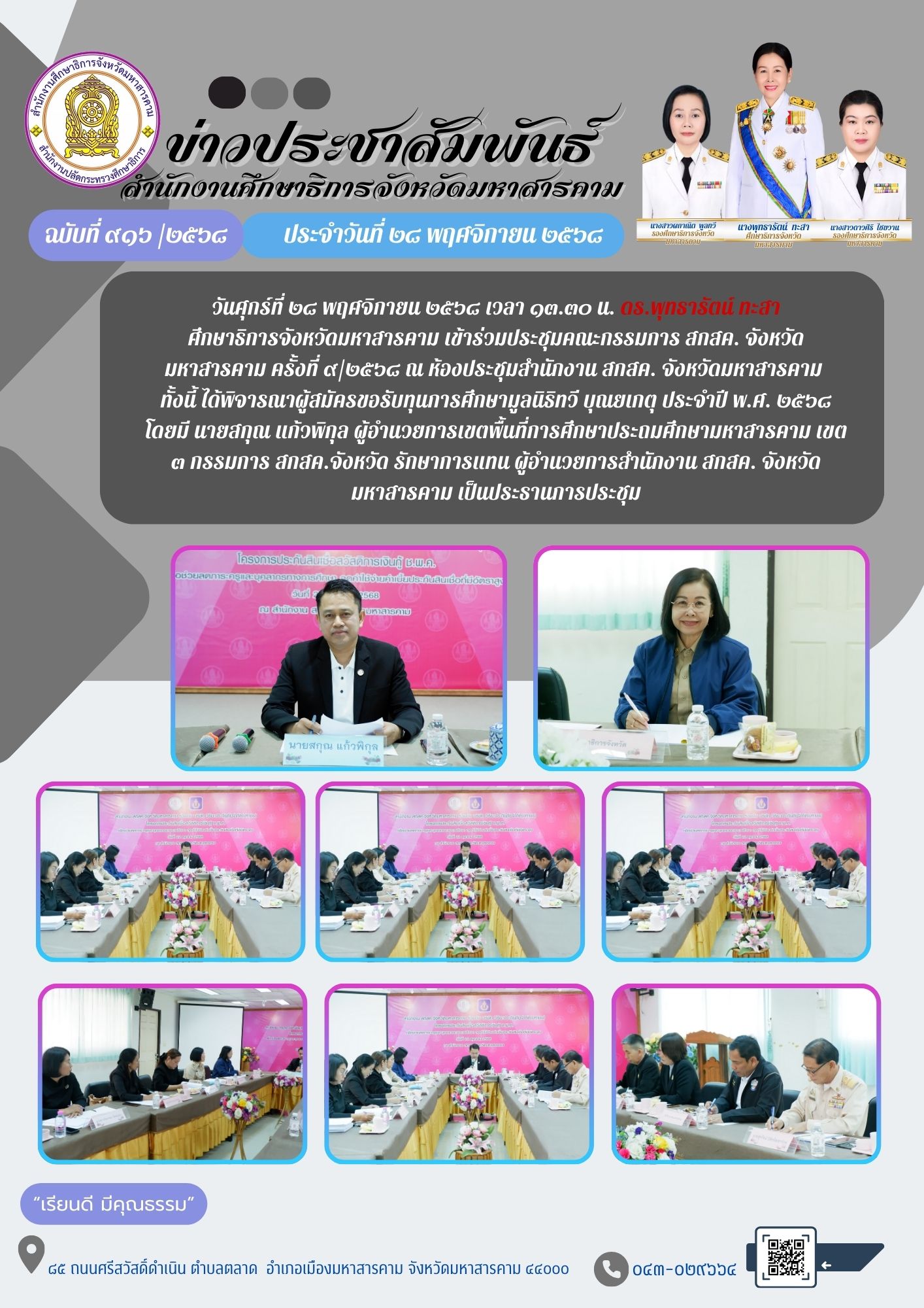 วันศุกร์ที่ ๒๘ พฤศจิกายน ๒๕๖๘ เวลา ๑๓.๓๐ น. ดร.พุทธารัตน์ ทะสา ศึกษาธิการจังหวัดมหาสารคาม เข้าร่วมประชุมคณะกรรมการ สกสค. จังหวัดมหาสารคาม ครั้งที่ ๙/๒๕๖๘ ณ ห้องประชุมสำนักงาน สกสค. จังหวัดมหาสารคาม ทั้งนี้ ได้พิจารณาผู้สมัครขอรับทุนการศึกษามูลนิธิทวี บุณยเกตุ ประจำปี พ.ศ. ๒๕๖๘ โดยมี นายสกุณ แก้วพิกุล ผู้อำนวยการเขตพื้นที่การศึกษาประถมศึกษามหาสารคาม เขต ๓ กรรมการ สกสค.จังหวัด รักษาการแทน ผู้อำนวยการสำนักงาน สกสค. จังหวัดมหาสารคาม เป็นประธานการประชุม