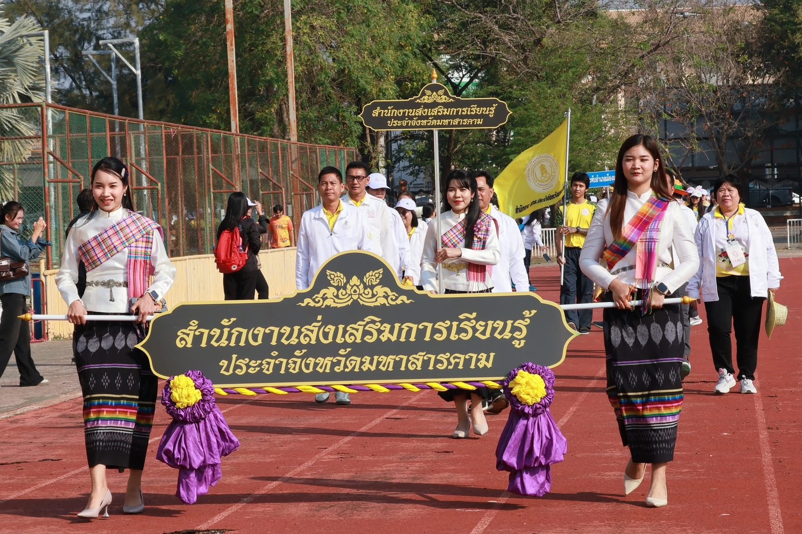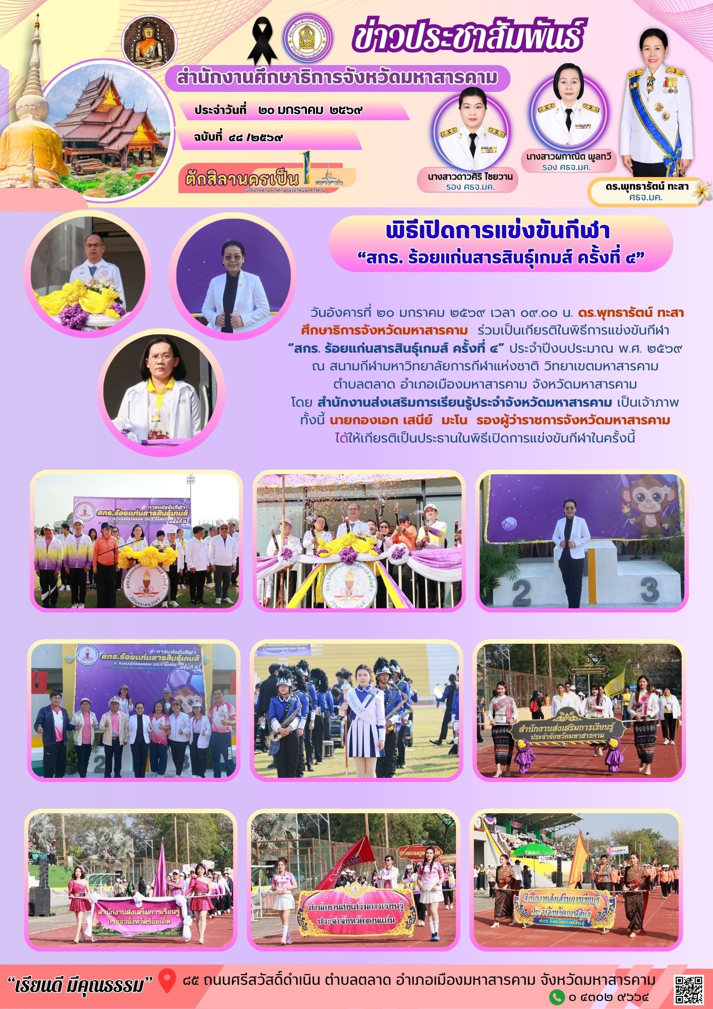 วันอังคารที่ ๒๐ มกราคม ๒๕๖๙ เวลา ๐๙.๐๐ น. ดร. พุทธารัตน์ ทะสา ศึกษาธิการจังหวัดมหาสารคาม ร่วมเป็นเกียรติพิธีเปิดการแข่งขันกีฬา สกร. ร้อยแก่นสารสินธุ์เกมส์ ครั้งที่ ๔ ณ สนามมหาวิทยาลัยการกีฬาแห่งชาติ วิทยาเขตมหาสารคาม อำเภอเมืองมหาสารคาม จังหวัดมหาสารคาม ทั้งนี้ สำนักงานส่งเสริมการเรียนรู้ประจำจังหวัดมหาสารคามเป็นเจ้าภาพ โดยมี นายกองเอก เสนีย์ มะโน รองผู้ว่าราชการจังหวัดมหาสารคาม เป็นประธาน
