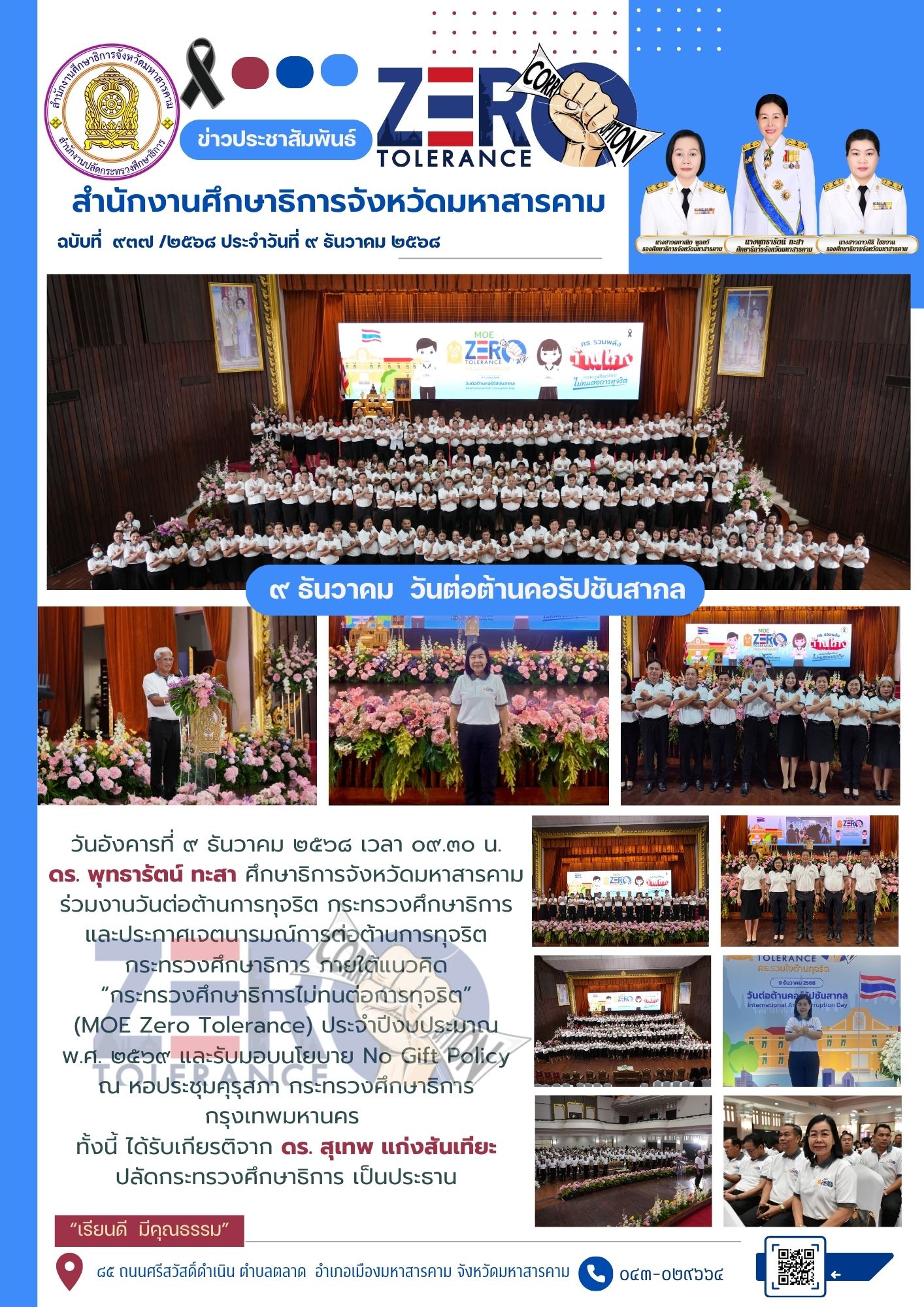 กิจกรรม วันอังคารที่ ๙ ธันวาคม ๒๕๖๘ เวลา ๐๙.๓๐ น. ดร. พุทธารัตน์ ทะสา ศึกษาธิการจังหวัดมหาสารคาม ร่วมงานวันต่อต้านการทุจริต กระทรวงศึกษาธิการ และประกาศเจตนารมณ์การต่อต้านการทุจริต กระทรวงศึกษาธิการ ภายใต้แนวคิด “กระทรวงศึกษาธิการไม่ทนต่อการทุจริต” (MOE Zero Tolerance) ประจำปีงบประมาณ พ.ศ. ๒๕๖๙ และรับมอบนโยบาย No Gift Policy ณ หอประชุมคุรุสภา กระทรวงศึกษาธิการ กรุงเทพมหานคร ทั้งนี้ ได้รับเกียรติจาก ดร. สุเทพ แก่งสันเทียะ ปลัดกระทรวงศึกษาธิการ เป็นประธาน Posted on 11 December 202511 December 2025 by admin admin วันอังคารที่ ๙ ธันวาคม ๒๕๖๘ เวลา ๐๘.๓๐ น. ดร. พุทธารัตน์ ทะสา ศึกษาธิการจังหวัดมหาสารคาม มอบหมายให้ นางสาวดาวศิริ ไชยวาน รองศึกษาธิการจังหวัดมหาสารคาม เข้าร่วมกิจกรรมวันต่อต้านคอร์รัปชั่นสากลประเทศไทยจังหวัดมหาสารคาม ณ ห้องประชุมพระบรมธาตุนาดูน ชั้น ๔ ศาลากลางจังหวัดมหาสารคาม โดยมี นายกนก ศรีวิชัยนันท์ รองผู้ว่าราชการจังหวัดมหาสารคาม เป็นประธาน