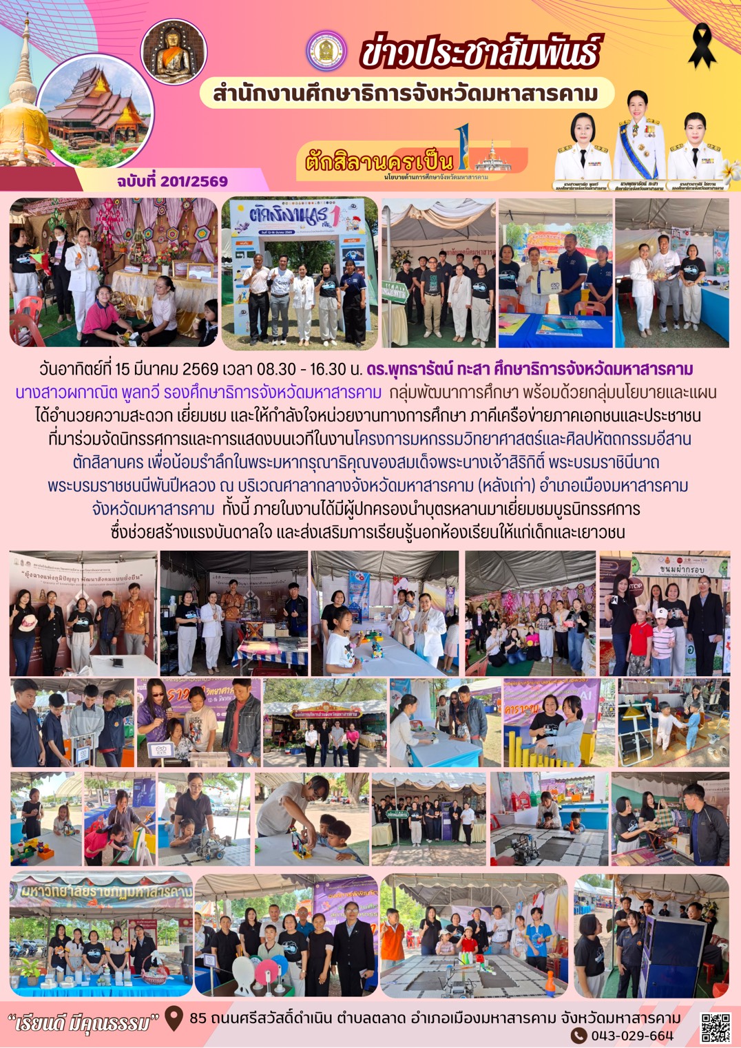 กิจกรรม วันอาทิตย์ที่ 15 มีนาคม 2569 เวลา 08.30 – 16.30 น. ดร.พุทธารัตน์ ทะสา ศึกษาธิการจังหวัดมหาสารคาม นางสาวผกาณิต พูลทวี รองศึกษาธิการจังหวัดมหาสารคาม กลุ่มพัฒนาการศึกษา พร้อมด้วยกลุ่มนโยบายและแผน ได้อำนวยความสะดวก เยี่ยมชม และให้กำลังใจหน่วยงานทางการศึกษา ภาคีเครือข่ายภาคเอกชนและประชาชน ที่มาร่วมจัดนิทรรศการและการแสดงบนเวทีในงานโครงการมหกรรมวิทยาศาสตร์และศิลปหัตถกรรมอีสาน ตักสิลานคร เพื่อน้อมรำลึกในพระมหากรุณาธิคุณของสมเด็จพระนางเจ้าสิริกิติ์ พระบรมราชินีนาถ พระบรมราชชนนีพันปีหลวง ณ บริเวณศาลากลางจังหวัดมหาสารคาม (หลังเก่า) อำเภอเมืองมหาสารคาม จังหวัดมหาสารคาม ทั้งนี้ ภายในงานได้มีผู้ปกครองนำบุตรหลานมาเยี่ยมชมบูธนิทรรศการ ซึ่งช่วยสร้างแรงบันดาลใจ และส่งเสริมการเรียนรู้นอกห้องเรียนให้แก่เด็กและเยาวชน Posted on 16 March 2026 by admin admin วันเสาร์ที่ 14 มีนาคม 2569 เวลา 08.30 – 16.30 น. ดร.พุทธารัตน์ ทะสา ศึกษาธิการจังหวัดมหาสารคาม มอบหมายให้ กลุ่มนิเทศ ติดตามและประเมินผล พร้อมด้วยกลุ่มนโยบายและแผน ปฏิบัติหน้าที่ อำนวยความสะดวก เยี่ยมชม และให้กำลังใจหน่วยงาน ทางการศึกษา ภาคีเครือข่ายภาคเอกชนและประชาชน ที่มาร่วมจัดนิทรรศการและการแสดงบนเวทีในงานโครงการมหกรรมวิทยาศาสตร์และศิลปหัตถกรรมอีสานตักสิลานคร เพื่อน้อมรำลึกในพระมหากรุณาธิคุณของสมเด็จพระนางเจ้าสิริกิติ์ พระบรมราชินีนาถ พระบรมราชชนนีพันปีหลวง ทั้งนี้ ภายในงาน ได้มีผู้ปกครองนำบุตรหลานมาเยี่ยมชมบูธนิทรรศการ ซึ่งช่วยสร้างแรงบันดาลใจ และส่งเสริมการเรียนรู้ นอกห้องเรียนให้แก่เด็กและเยาวชน วันที่ ๑๕ มีนาคม ๒๕๖๙ เวลา ๐๙.๐๐ น. ดร.พุทธารัตน์ ทะสา ศึกษาธิการจังหวัดมหาสารคาม เข้าร่วมการประชุมสัมมนาวิชาการ ระดับชาติและนานาชาติ ครั้งที่ ๔ ภายใต้หัวข้อ โรงเรียนขนาดเล็ก : รูปแบบการบริหารและการพัฒนาอย่างยั่งยืน พร้อมทั้งรับโล่รางวัลและเกียรติบัตรในฐานะหน่วยงาน ที่ให้การสนับสนุนและส่งเสริมความร่วมมือทางวิชาการ จัดโดย มหาวิทยาลัยศรีปทุม วิทยาเขตขอนแก่น ร่วมกับ สมาคมศิษย์เก่าบริหารการศึกษา มหาวิทยาลัยศรีปทุม วิทยาเขตขอนแก่นและหน่วยงานในเครือข่าย ณ โรงแรม Avani Khon Kaen Hotel & Convention Centre ตำบลในเมือง อำเภอเมืองขอนแก่น จังหวัดขอนแก่น ทั้งนี้ ได้รับเกียรติจาก ดร. กมล รอดคล้าย ประธานคณะกรรมาธิการการศึกษา การอุดมศึกษาวิทยาศาสตร์ วิจัยและนวัตกรรม เป็นประธาน