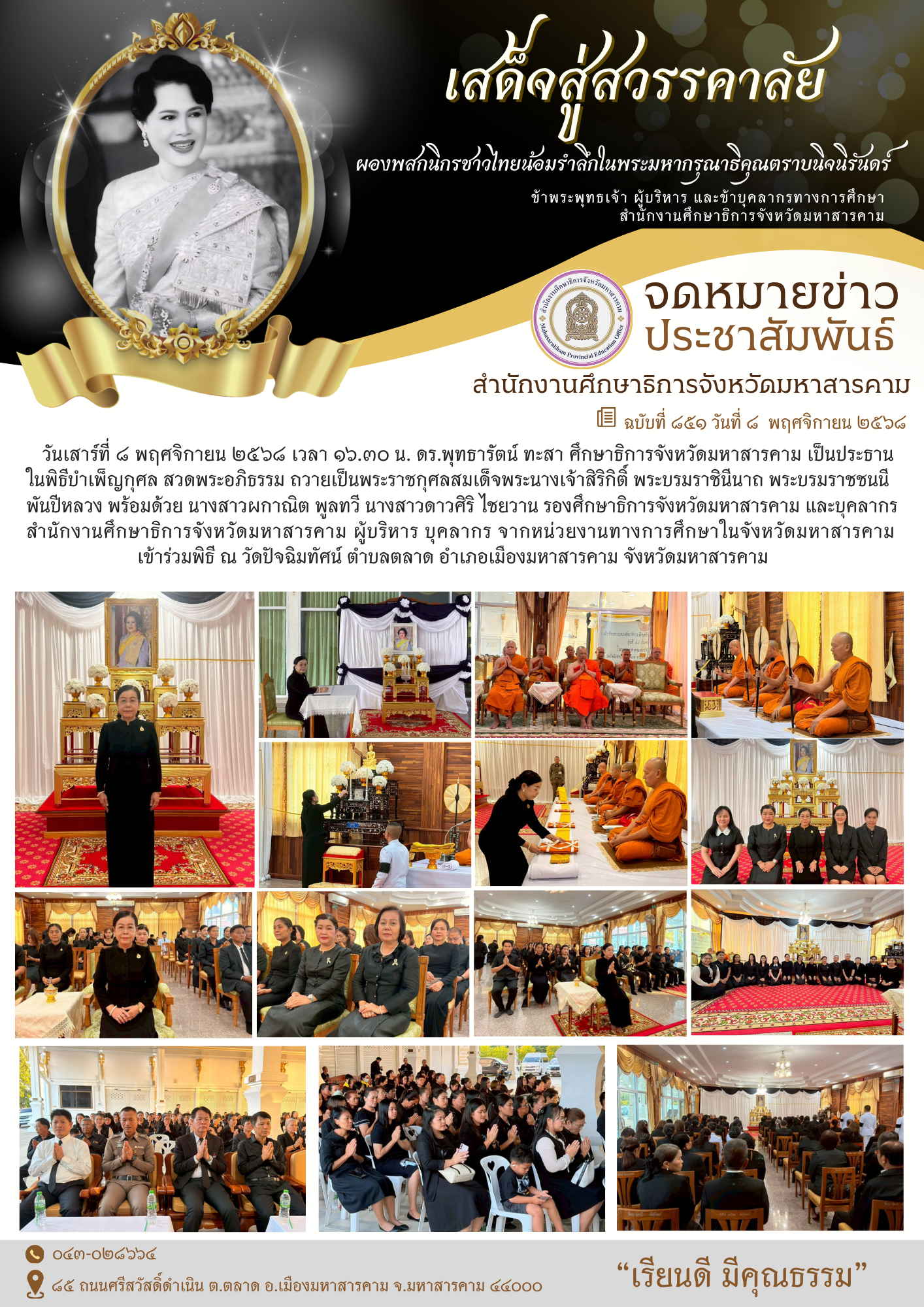 วันเสาร์ที่ ๘ พฤศจิกายน ๒๕๖๘ เวลา ๑๖.๓๐ น. ดร.พุทธารัตน์ ทะสา ศึกษาธิการจังหวัดมหาสารคาม เป็นประธานในพิธีบำเพ็ญกุศล สวดพระอภิธรรม ถวายเป็นพระราชกุศลสมเด็จพระนางเจ้าสิริกิติ์ พระบรมราชินีนาถ พระบรมราชชนนีพันปีหลวง พร้อมด้วย นางสาวผกาณิต พูลทวี นางสาวดาวศิริ ไชยวาน รองศึกษาธิการจังหวัดมหาสารคาม และบุคลากรสำนักงานศึกษาธิการจังหวัดมหาสารคาม ผู้บริหาร บุคลากร จากหน่วยงานทางการศึกษาในจังหวัดมหาสารคาม เข้าร่วมพิธี ณ วัดปัจฉิมทัศน์ ตำบลตลาด อำเภอเมืองมหาสารคาม จังหวัดมหาสารคาม