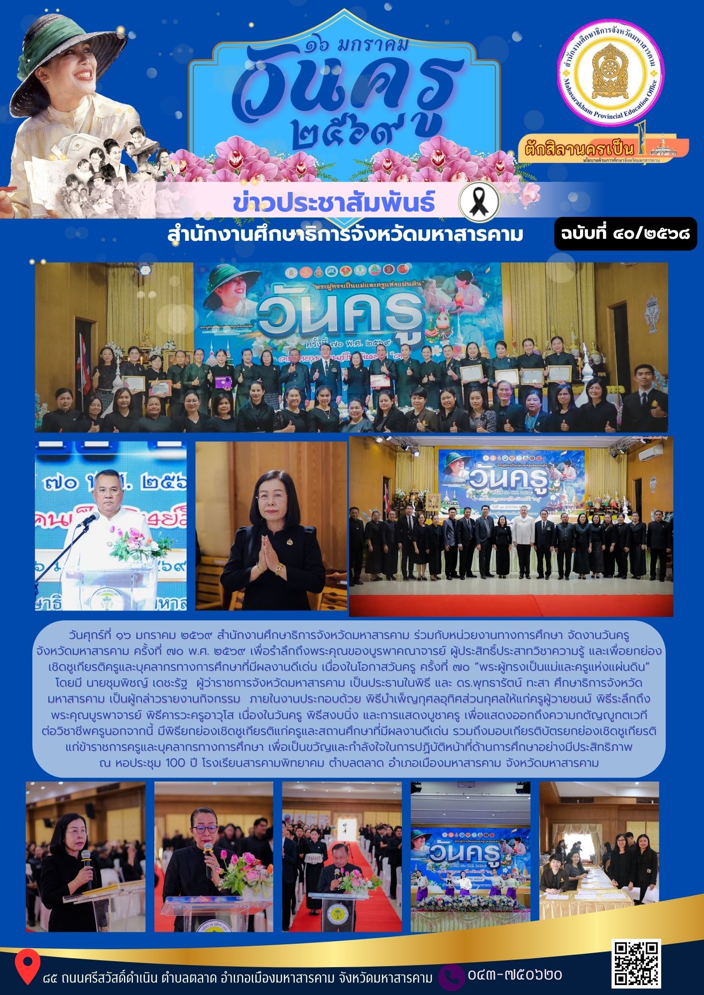 กิจกรรม วันศุกร์ที่ ๑๖ มกราคม ๒๕๖๙ สำนักงานศึกษาธิการจังหวัดมหาสารคาม ร่วมกับหน่วยงานทางการศึกษา จัดงานวันครู จังหวัดมหาสารคาม ครั้งที่ ๗๐ พ.ศ. ๒๕๖๙ เพื่อรำลึกถึงพระคุณของบูรพาคณาจารย์ ผู้ประสิทธิ์ประสาทวิชาความรู้ และเพื่อยกย่องเชิดชูเกียรติครูและบุคลากรทางการศึกษาที่มีผลงานดีเด่น เนื่องในโอกาสวันครู ครั้งที่ ๗๐ “พระผู้ทรงเป็นแม่และครูแห่งแผ่นดิน” โดยมี นายชุมพิชญ์ เดชะรัฐ ผู้ว่าราชการจังหวัดมหาสารคาม เป็นประธานในพิธี และ ดร.พุทธารัตน์ ทะสา ศึกษาธิการจังหวัดมหาสารคาม เป็นผู้กล่าวรายงานกิจกรรม ภายในงานประกอบด้วย พิธีบำเพ็ญกุศลอุทิศส่วนกุศลให้แก่ครูผู้วายชนม์ พิธีระลึกถึงพระคุณบูรพาจารย์ พิธีคารวะครูอาวุโส เนื่องในวันครู พิธีสงบนิ่ง และการแสดงบูชาครู เพื่อแสดงออกถึงความกตัญญูกตเวที ต่อวิชาชีพครูนอกจากนี้ มีพิธียกย่องเชิดชูเกียรติแก่ครูและสถานศึกษาที่มีผลงานดีเด่น รวมถึงมอบเกียรติบัตรยกย่องเชิดชูเกียรติแก่ข้าราชการครูและบุคลากรทางการศึกษา เพื่อเป็นขวัญและกำลังใจในการปฏิบัติหน้าที่ด้านการศึกษาอย่างมีประสิทธิภาพ ณ หอประชุม 100 ปี โรงเรียนสารคามพิทยาคม ตำบลตลาด อำเภอเมืองมหาสารคาม จังหวัดมหาสารคาม Posted on 19 January 202619 January 2026 by admin admin วันที่ ๑๙ มกราคม ๒๕๖๙ เวลา ๐๙.๓๐ น. ดร.พุทธารัตน์ ทะสา ศึกษาธิการจังหวัดมหาสารคาม พร้อมด้วย ดร.กาญจนา วิเศษรินทอง ผู้อำนวยการกลุ่มนิเทศติดตามและประเมินผล ดร.นงลักษณ์ มีแก้ว ศึกษานิเทศก์ และ นางสาวธนาภา บุญครอบ ศึกษานิเทศก์ เข้าร่วมประชุม ตามโครงการพัฒนาสมรรถนะครู และบุคลากรทางการศึกษา โดยความร่วมมือของภาคีเครือข่ายในระดับพื้นที่ ประจำปีงบประมาณ พ.ศ. ๒๕๖๙ เพื่อสร้างความเข้าใจในการดำเนินโครงการพัฒนาสมรรถนะครูตามกรอบของ PISA ที่มุ่งเน้นการยกระดับสมรรถนะครูให้สามารถจัดการเรียนรู้ที่ส่งเสริมทักษะแห่งศตวรรษที่ ๒๑ จัดโดยสถาบันพัฒนาครู คณาจารย์ และบุคลากรทางการศึกษา ด้วยการประชุมออนไลน์ผ่านระบบ ZOOM Meeting